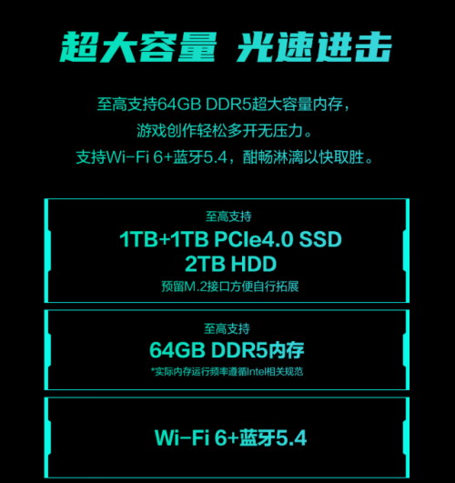 面对大型游戏和海量数据,存储性能已成为影响游戏体验的关键因素。全新的华硕天选6X台式机,标配32G DDR5高频内存与1T Pcie 4.0 SSD的存储组合,高频内存为游戏响应和系统稳定带来保证;而高速的固态硬盘,在提供充沛游戏下载空间的同时,为游戏、素材的加载时间大幅缩短,让玩家更快地进入游戏世界。