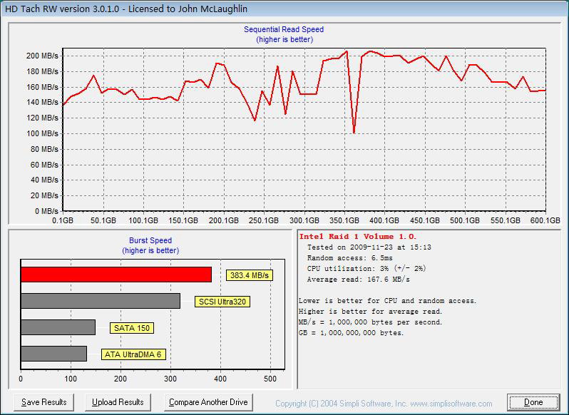 正是由于Ailenware Area-51 ALX标配了6块硬盘,因此我们可以尝试并不经常用到的Raid0+1阵列。从测试结果来看磁盘传输速率却达到了惊人的167.6MB/s,磁盘传输速度的记录被刷新,追求速度对存储容量要求不高的朋友Raid0+1是你的较好选择。