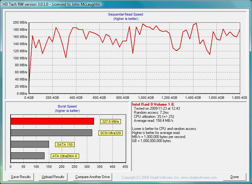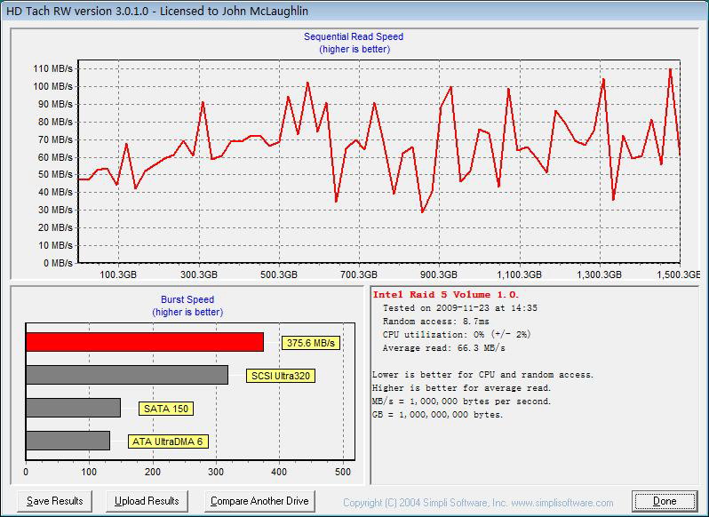 戴尔Ailenware Area-51 ALX的主板为Intel优异的X58,单硬盘的磁盘平均读取速度就已经达到了106MB/s,这个成绩已经是单硬盘的高水平表现了。