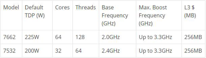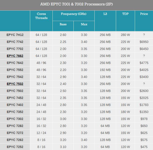 此次AMD推出的两款处理器分别是EPYC 7662和EPYC 7532。两款处理器均为7nm制程Zen 2架构二代霄龙产品。其中EPYC 7662拥有目前二代霄龙最优异的64核心128线程设计,主频2GHz,最大睿频3.3GHz,功耗225W,AMD称这颗EPYC 7662相对其他已发售的64核心处理器要更加便宜。