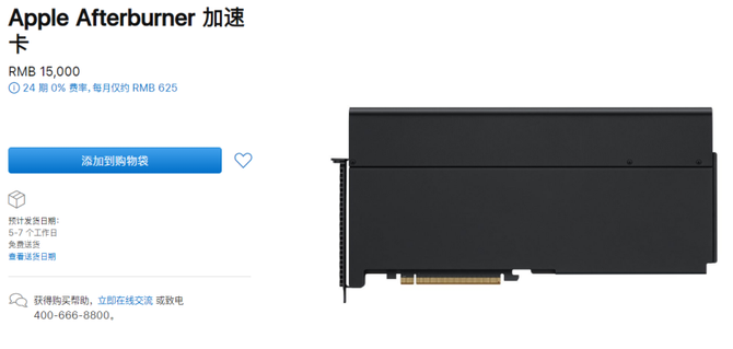 当然,这张加速卡的售价也是相当贵的,无论是配套Mac Pro购买还是单独购买都需要15000元,单买同样支持24期分期免息。需要注意的是,这张是专用的加速卡,并非显卡,并不能进行显示输出,仅面向有专业视频剪辑需求的用户。