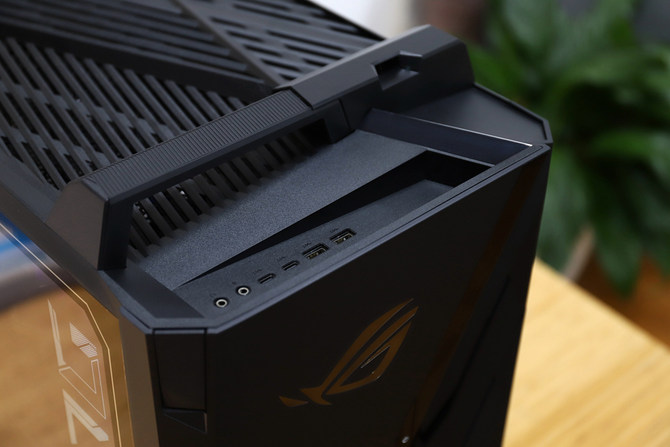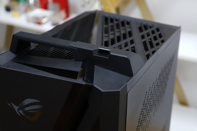机身上方设计有提手,便于移动。但是差不多15kg的整机重量,加上主机本身相比常见的机箱要宽体一些,所以也很难手提很远的距离,但相比抱在怀里搬运,手提反而会有种安全感。此外,整个机身顶部体也设计了很大面积的散热格栅,造型上更加立体而有力量。