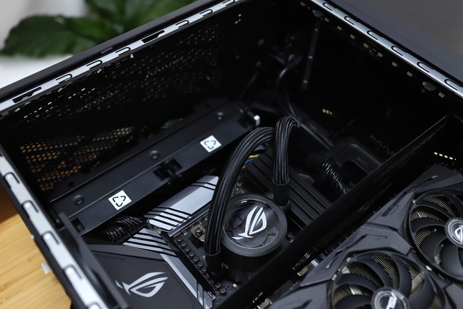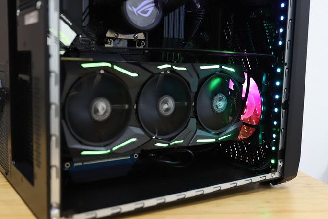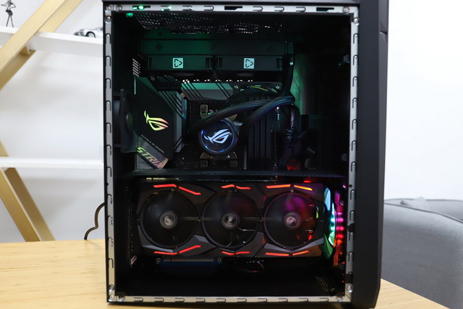 ROG光魔G35机箱内部采用了腔室分隔的解决方案,所以整个机箱看上去很宽体,这样做的好处也是显而易见,毕竟要想发挥高端硬件的全部潜能,必须要有充足的散热空间,所以我们看到锐龙9 3950X处理器采用了240mm水冷散热,RTX 2080Ti显卡上有三个散热风扇,机身后部和电源都有自己独立的空间和散热风扇,以及内存、硬盘都做了散热马甲,再加上机身大面积的散热格栅,所以这是一个经过特别优化设计的机箱,目的就是确保性能强力释放和长时间保持稳定运行。