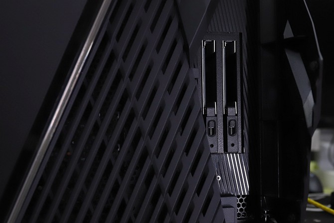 在机身前部的右下角还隐藏了一个小秘密,那就是这款主机还支持外接硬盘的扩展,提供了两个快拆机械硬盘位,对于需要经常交换大文件,或者是当作数据仓库的用户,这个扩展就太有用了。