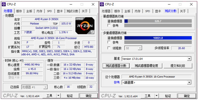 AMD在去年底推出了第三代7nm制程工艺的锐龙9 3950X处理器,其拥有的16核32线程的配置,是目前AMD中除了线程撕裂者之外最强的处理器。基础频率3.50 GHz,单核加速时钟频率4.70GHz,64MB三级缓存,TDP105W,支持DDR-3200MHz内存,在搭配X570平台的PCIe 4.0之后,在易用性和拓展性上将发挥更强悍的性能,而这款G35台式机主板正是X570芯片组,同时支持PCIe 4.0。下图是这款台式机的CPU-Z信息和测试分数,可以看到其单核任务得分达到526.7,多核任务得分更是达到10851.8的性能水平。