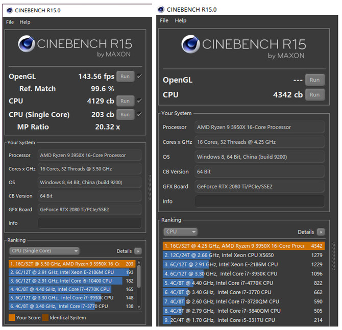 CINEBENCH R15主要加强了着色器、抗锯齿、阴影、灯光以及反射模糊等的考察,是CPU性能检测常用的软件之一。在R15测试平台上,这款AMD锐龙9 3950X在未超频的情况下,多核性能轻松跑到4129cb的成绩。超频后可以达到4342cb,约有5%的性能提升。