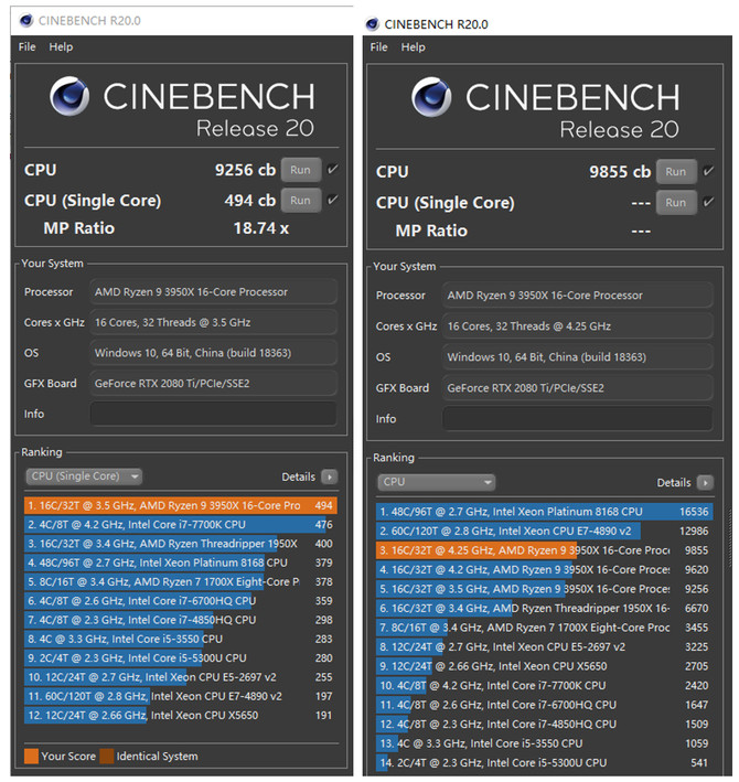 Cinebench R20能更准确地测试CPU的性能,判断不同CPU的能力差距。该测试场景非常复杂,需要“8倍左右渲染速度的计算能力”和“大概4倍的内存”,所以针对更强性能的CPU,目前也大多采用R20进行评测,这里值得一提的是,锐龙9 3950X处理器搭配DDR4 3200MHz规格的内存,性能表现十分明显。