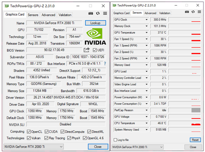 性能参数方面,ROG STRIX GeForce RTX 2080 Ti显卡基于 NVIDIA® Turing™架构打造,核心代号TU102,12nm工艺,拥有11GB GDDR6 显存,拥有4352个着色器,272个纹理单元,总线位宽352bit,Boost频率1545MHz,