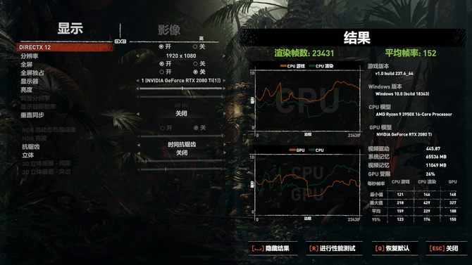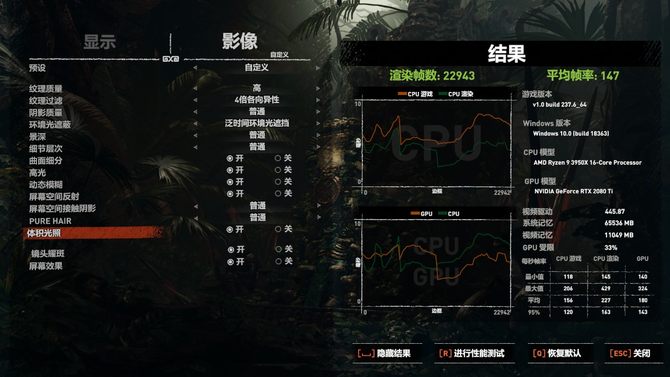 古墓丽影已经更新了光追技术,我们使用内置的性能测试,在默认影像为高的设置下,渲染帧数23431,平均帧率达到152,自定义调高纹理质量,开启光追效果,渲染帧数22943,平均帧率为147,同样能够非常流畅运行。