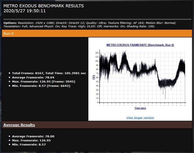 《地铁离去》测试,我们运行RTX光追模式,最终获得最大126.95的帧率,平均达到78帧,可流畅运行。