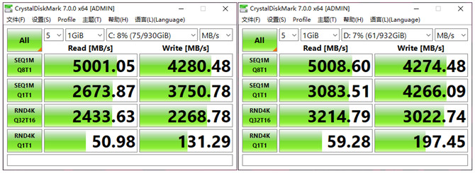 我们分别对两块固态硬盘进行读写速度的测试,C盘顺序读取速度达到了5001.05MB/s,写入速度达到4280.48MB/s,D盘读取速度达到了5008.60MB/s,写入速度达到4274.48MB/s,相差无几,性能非常稳定,该成绩同样也达到了目前的旗舰级水平,为大数据传输和程序运行带来极速体验。