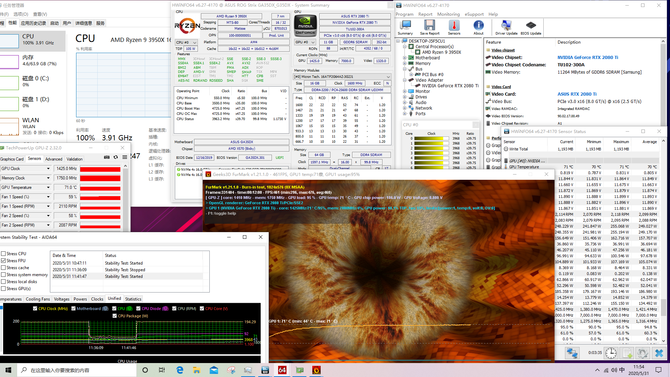 之后再同时运行Furmark进行双烤,12分钟GPU温度稳定在最大71°C,当关闭运行,几乎是数秒就能恢复到正常水平。可见在散热方面,水冷+优化的散热方案优势明显。