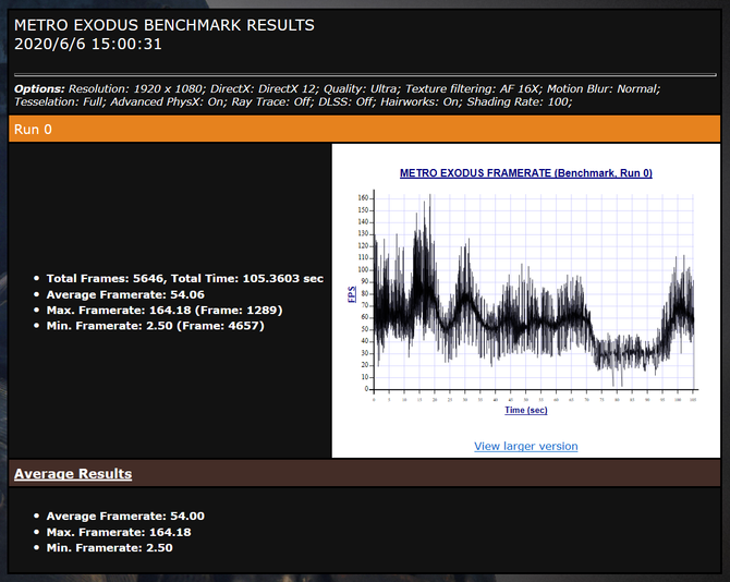 在《地铁离去》的游戏测试中,我们使用内置的Benchmark,设置RTX测试,也就是支持光追的显卡测试,最终平均帧率为54FPS,想要体验带有光追效果的游戏,惠普 ENVY TE01台式机同样不会令你失望。