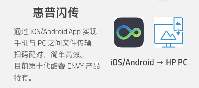 全新一代的惠普ENVY TE01台式机还支持惠普闪传功能,这也是惠普台式机里少有支持该功能的台式机,通过闪传,能够实现PC与手机的连接,支持苹果iOS和Android系统的手机,通过扫描简单的配对后,就能在PC和手机之间自由传送文件,让办公效率更高。