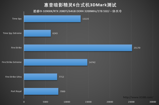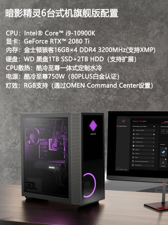 我们评测的这款惠普暗影精灵6游戏台式机搭载了英特尔第十代酷睿i9-10900K,以及具有光追技术的英伟达RTX 2080Ti 11G独显,金士顿骇客16GB×4 DDR4 3200MHz高带宽内存,硬盘存储为西数黑盘1TB PCIe高速固态,CPU散热搭载的是Cooler Master一体化水冷系统,所以整机配置相当豪华。此外,该系列机型还有其它多个配置的版本可选,玩家可以根据需求和预算进行合理选择。