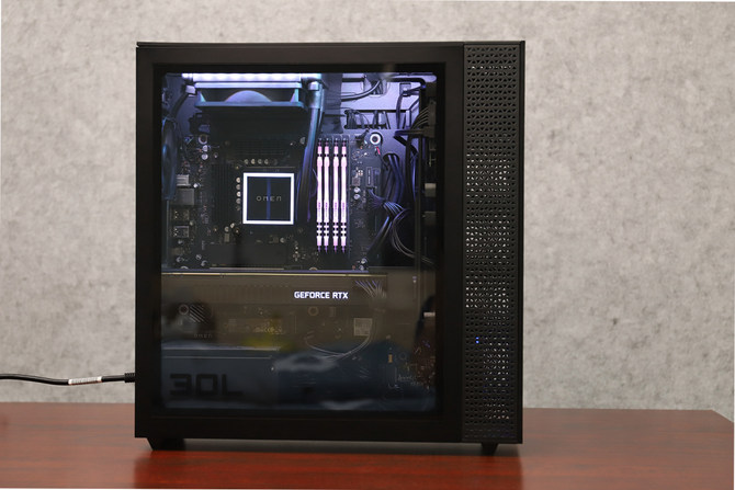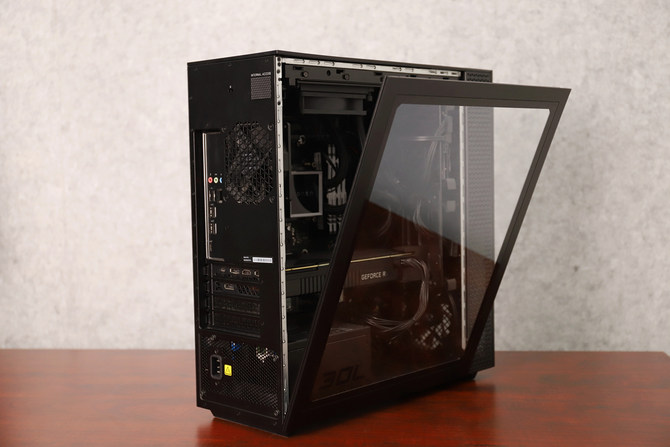 约30L的内部空间,可以轻松放下一体式定制水冷、全尺寸的RTX 2080Ti显卡。整机内部走线工整,布局合理,尽管有水冷散热系统和显卡,但是一点儿也不显得拥挤。