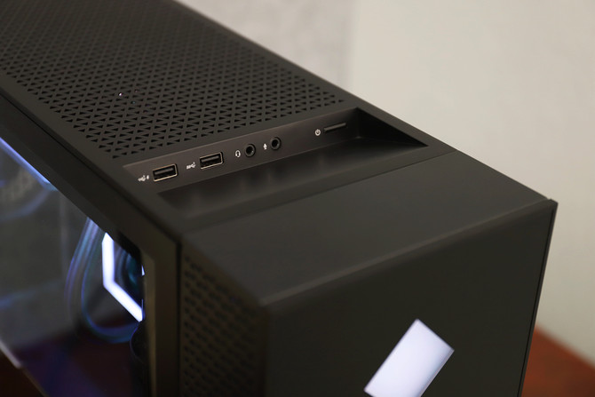 暗影精灵6游戏台式机提供了完备的接口,机箱顶部设计了一个斜的凹槽,提供两个Type-A USB 3.1接口,两个3.5mm耳麦和麦克风插孔,以及电源键,这样的设计不易造成误按。