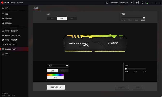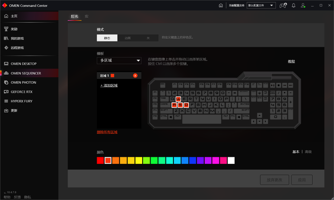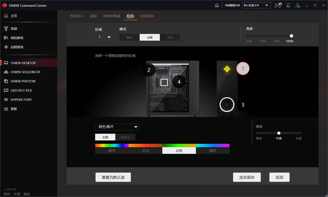 暗影精灵6台式机旗舰版支持4个可调区域的RGB灯效,用户可以通过惠普游戏控制中心对不同区域的灯效进行设置。值得一提的是,如果你正好购买了暗影精灵家族的外设产品,比如显示器、鼠标、键盘等,系统就会自动将它们添加到左侧的列表中,用户可以在相应的界面中调节灯效,进行个性化设置。