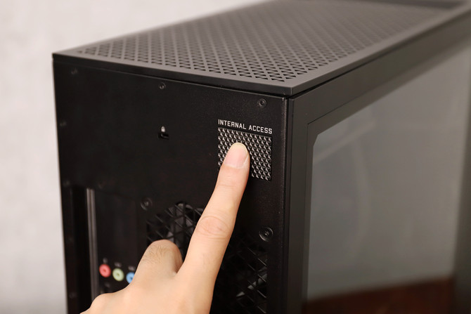 新款的暗影精灵6游戏主机外形尺寸为165mm(宽)×433mm(高)×422mm(深),容积约30L。拆卸侧面板也变的非常快捷和简便,只需要按一下机箱后部的这个按钮,就可以轻松开启左侧的玻璃面板,相比使用螺钉的主机来说,这样的设计更加贴心,便于日后硬件的升级扩展。