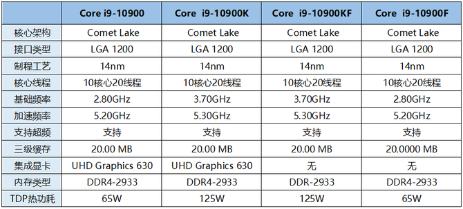 对比上一代的酷睿i9-9900K三级缓存由16MB提升到了20MB,核心线程数由8核16线程升级为10核20线程,意味着在程序多开、生产力创作等用途更具备优势,TDP功耗也有所提升,达到了125W,而在制程工艺、内置核显、超频特性保持相同,而提升最亮眼的就是多线程性能。即便是在整个10900系列,酷睿i9-10900K也是最强选手。