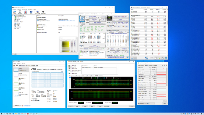首先使用AIDA64的FPU进行单烤,室温24°,运行前进行关机冷却后开机,超频状态为默认模式,风扇Turbo。拥有10个核心的i9-10900K处理器,运行60分钟后,平均高温度83°C,频率可稳定在4.34GHz左右。