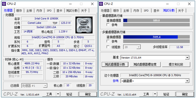 CPU-Z基准测试工具,单核任务得分589.0,多核任务成绩达到了7411.4,相比我们此前测试的酷睿i9-9900K在单核上的得分略有提升,但是在多核任务下的得分有很大提升。