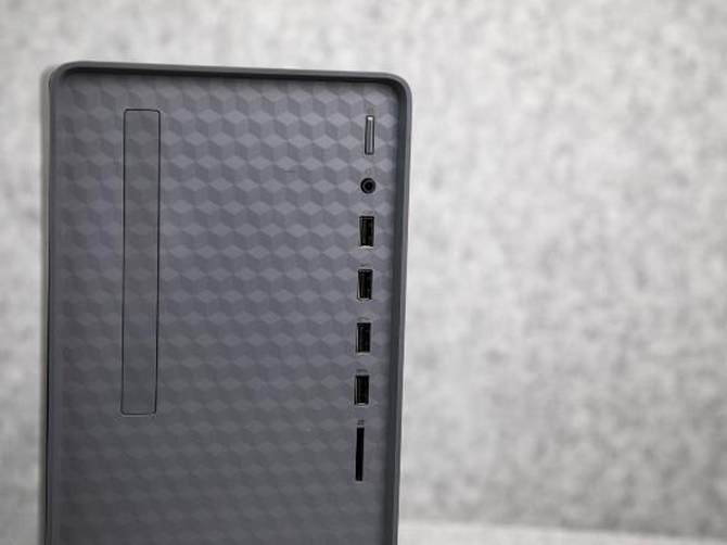 机身的正面采用了非常简约的几何图形装饰,搭配银灰色压花纹理,非常耐看,既可商用办公,又能居家使用,同时前面板还预留了光驱位,非常的贴心。