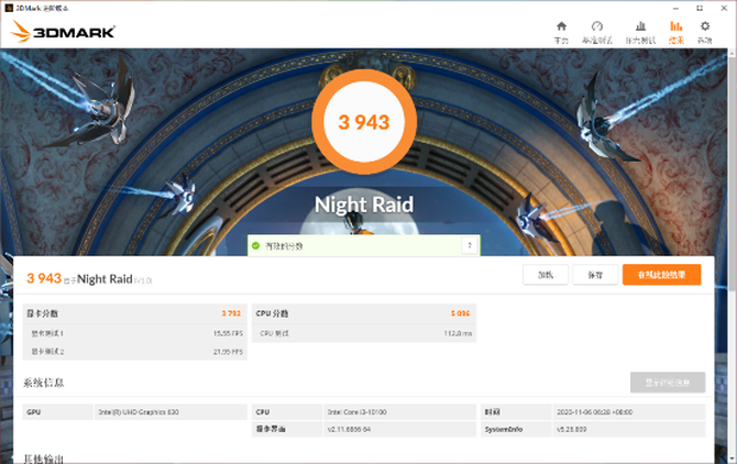 而Night Raid则是考验整机DX12性能的项目,最后的得分为3943,代表整机的图形渲染能力出色,能够进行后期视频的渲染工作,方便设计师群体后期建模和修图。
