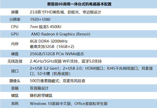 全新的惠普战66商用一体机拥有23.8英寸的微边框屏幕、可升降的隐藏式摄像头、满足各种商务连接的接口,以及高搭载了全新一代7nm锐龙4000U系列处理器,DDR4-3200MHz高频内存以及PCIe协议高速固态硬盘,支持双频无线WiFi,预装了微软Windows 10家庭中文版系统和Office家庭和学生版办公软件,并随机配备了键鼠套装。此外,这款一体机还获得国家电子计算机质量监督检验中心平均无故障时间不低于105万小时MFBF认证,大大减少宕机发生的机率,有效保障主机持久稳定运行。作为惠普经典的商用一体机产品,更是众多企业优选的办公利器,一步到位,性能可靠。