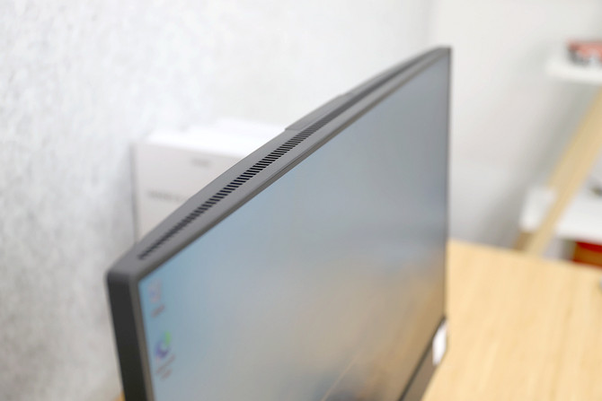 屏幕下方黑色面板,全部采用针孔状设计,提升了整机的时尚颜值度,而且还内置大功率双音响,正面相对聆听,声音洪亮有力,视频会议,或者是播放电影,在家里上网课等,这款音箱足够了。