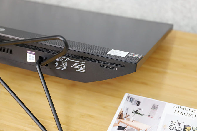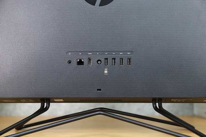背部的接口从左到右,包括耳机接口、RJ45网线、HDMI接口,圆形的电源接口位于中间,右侧是2个USB 2.0用于连接键盘鼠标,最右侧2个USB 3.2 Gen1接口,满足大数据的高速传输,此外,这款一体机还支持双频无线WiFi和蓝牙连接,能够满足日常办公的网络连接需求。