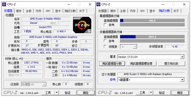 使用CPU-Z基准测试,单核成绩490.2,多核成绩达到2201.2,其性能表现足以秒杀上一代的锐龙5 3500U,同时也可以媲美4核心8线程的英特尔十代酷睿i5-10210U处理器,所以在计算应用方面,这款战66一体机毫无压力。