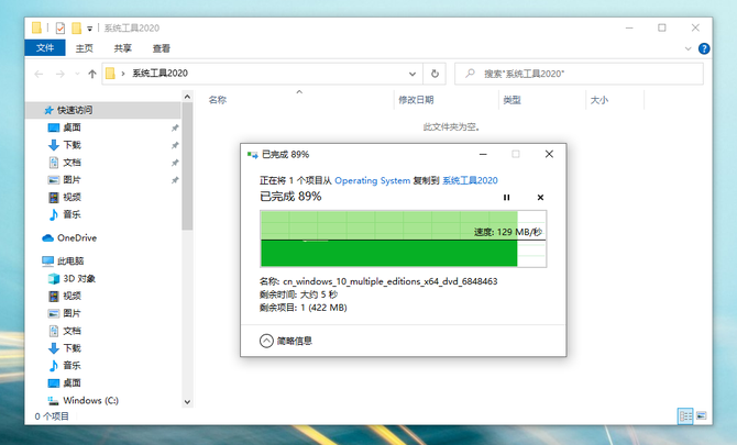 当然还有日常中复制大文件,更高速的固态硬盘等待的时间更短,效率也就大大提升。我们拷贝一个将近5GB的文件,可以看到其写入的速度稳定在129MB/s,已经相当之快了。