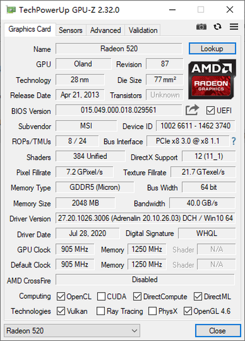 显卡方面,这款显卡为AMD的Radeon 520显卡,采用了28nm制程设计,拥有2GB的独立显存,频率为905MHz,可以应对日常大部分的网络游戏和PS作图等应用。