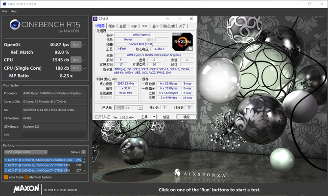 首先我们比较熟悉的CINEBENCH项目,在CINEBENCH R15中,AMD锐龙 4600G的多核心成绩为1545cb,单核心成绩为188cb,这样的成绩领先目前市面上绝大部分的家用级处理器。