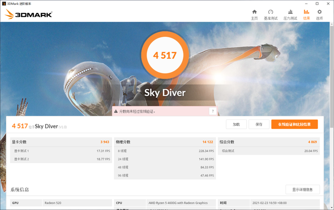 在另一个Sky Diver项目中,AMD 锐龙 5 4600G的得分为14122,同样能够满足大部分的网络游戏的运行要求,性能完全没有问题,在实际的应用中,这款处理器的性能表现也能够满足各种复杂后期任务的要求,而对于一般的上班族来讲,日常办公性能完全是绰绰有余。