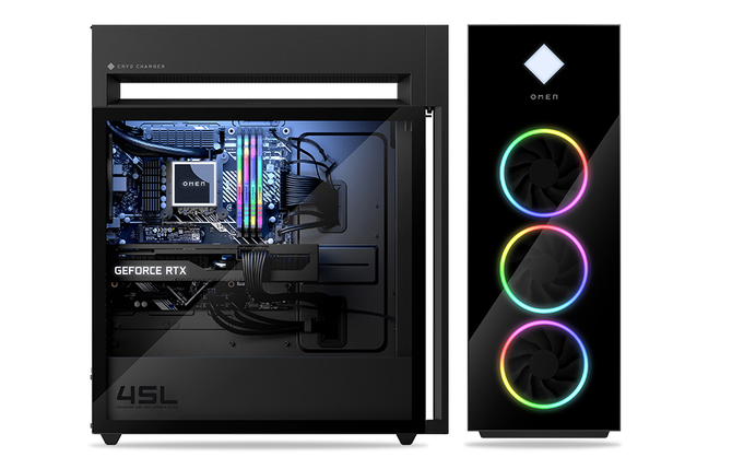 惠普 OMEN 暗影精灵 8 台式机旗舰版将炫酷与质感完美结合,机箱前面板和侧面板都采用了玻璃材质,时尚、庄重且大气,同时不失轻奢质感。透过机箱侧面的玻璃,OMEN LOGO、内部的散热风扇、CPU 水冷散热块、内存、显卡,以及机箱内部的氛围灯带等硬件一览无余的展现在面前。