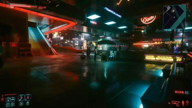 如此高的配置对于像《赛博朋克2077》这样的光追类游戏更是小菜一碟。该款游戏大量使用了撞色搭配,整个城市不仅霓虹灯发光,包括灯笼、广告牌、全息投影都组成了合理的光环境,营造出非常好的追光氛围。