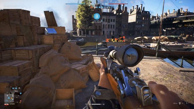 在《战地V》高画质的设置下,依然能表现出非常不错的流畅度,此时光线追踪和DLSS 2.0都是开启状态,我们能够清晰看到瞄准镜准确的反射了对面的建筑物。并且右侧码头水面上也有风吹过的波纹和杆子映出的倒影,一切都那么真实,基本与平时肉眼所见相同,这么逼真的游戏沉浸感十分难得。