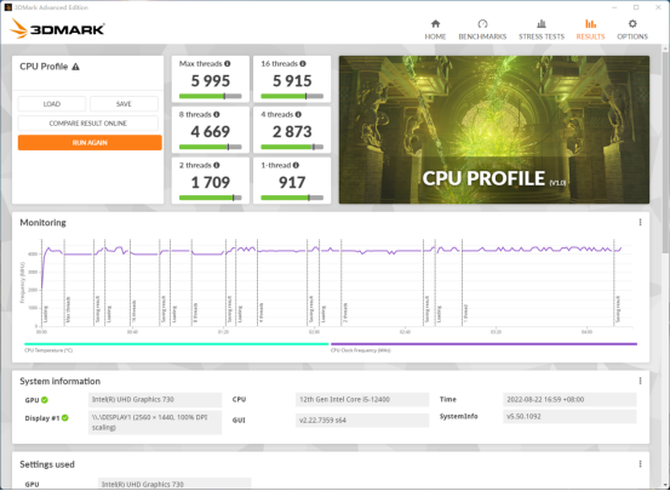 3DMARK是我们常用的测试软件之一,其中对于CPU性能测试的项目中,处理器的单程性能为917,最大线程性能得分为5995,性能表现出色。