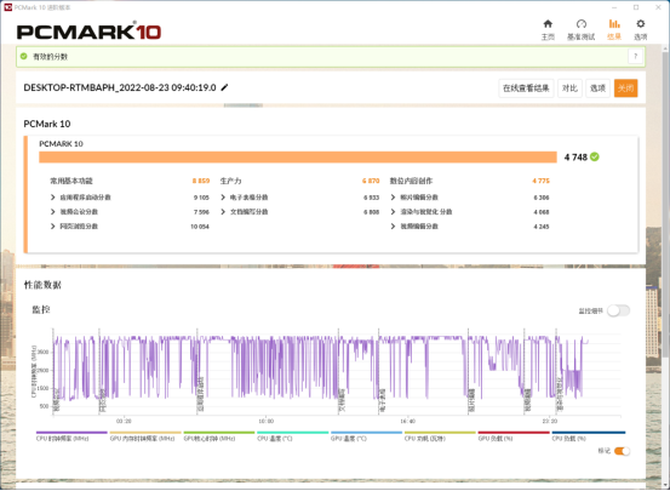 PCMARK10整机性能测试项目中,整机的得分为4748,其中基本功能得分为8859,生产力得分为5870,这样的成绩让这款商务办公主机能够轻松胜任基本的办公应用,比如浏览网页查资料,图表制作、分析,以及后期的图片视频编辑。
