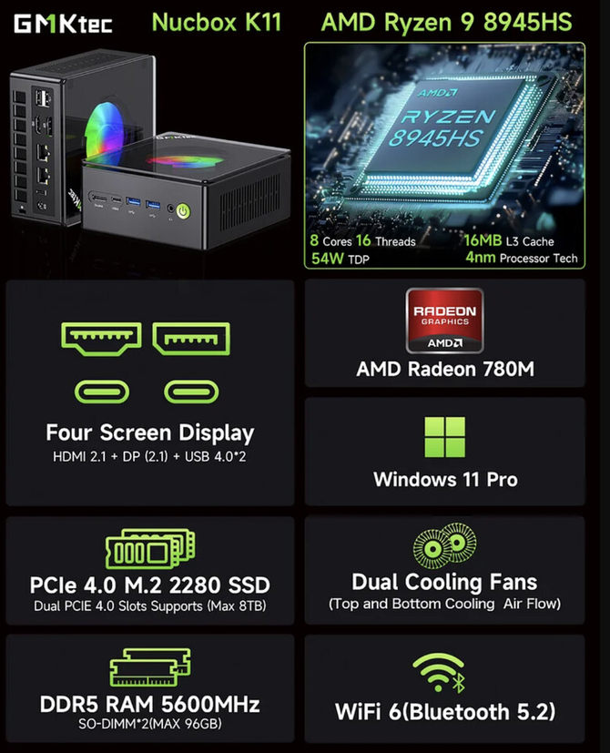 极摩客(GMKTec)最近推出K11迷你电脑,该机配备RGB灯效,其内部配置强大,足以应对几乎所有任务。K11的处理器搭载了Ryzen 9 8945HS“Hawk Point”APU,Zen 4架构,8核心和16个线程。该系统预装有高达32GB的内存和2TB的SSD,且两者日后均可升级。