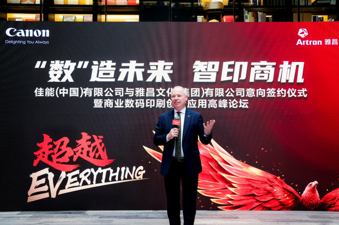 佳能(中国)有限公司高级副总裁江原大成也参加了签约仪式并表示:“中国印刷行业已迎来数字化转型浪潮,且已成为全球最具增长活力的数码印刷市场之一。佳能以技术革新赋能产业升级,提供智能化、绿色化的全流程解决方案,不断深耕细分场景,帮助客户实现从‘千篇一律’到‘千人多面’的跨越。我们很高兴与中国高端艺术印刷领域的标杆企业雅昌携手,佳能ProStream 2000系列数码喷墨打印机的落地不仅是技术合作,双方将共同探索艺术印刷行业更广泛的应用场景,助力更多艺术文化IP实现‘艺术价值’与‘商业效率’的双重突破。”