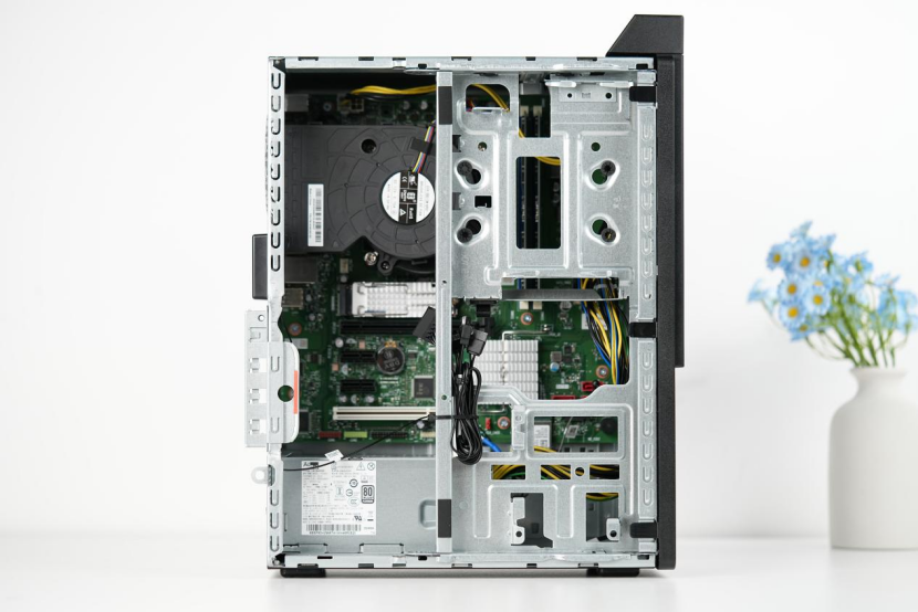 打开侧板的话,我们可以看到机箱的内部结构了,并且银色用来拓展硬盘和光驱的支架也支持快拆设计