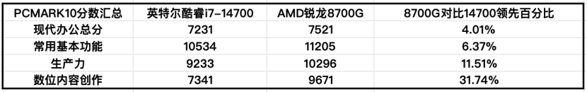 PCMark 10是一款综合性能测试工具,能够评估处理器在多种应用场景中的性能表现。在PCMark 10的综合测试中,锐龙7 8700G的得分7521,而酷睿i7-14700的得分为7231,锐龙7 8700G的性能领先约4%。在PCMark 10的各个子项测试中,锐龙7 8700G在应用程序启动速度、照片编辑性能、电子表格处理速度等方面均表现出色,特别是图形处理上,性能表现更加出色。