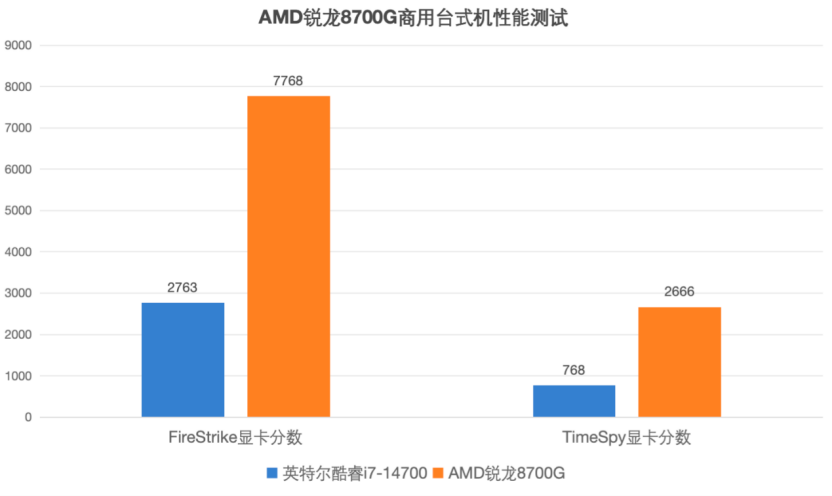 3D Mark是一款广泛使用的图形性能测试工具,能够评估处理器的图形处理能力。在3D Mark的FireStrike Graphics Score测试中,AMD锐龙7 8700G得分为7768,而英特尔酷睿i7-14700得分为2763,锐龙7 8700G的图形性能领先约180%。在TimeSpy Performance Graphics Score测试中,锐龙7 8700G得分为2666,酷睿i7-14700得分为168,性能差距更为明显,锐龙7 8700G领先约248%。