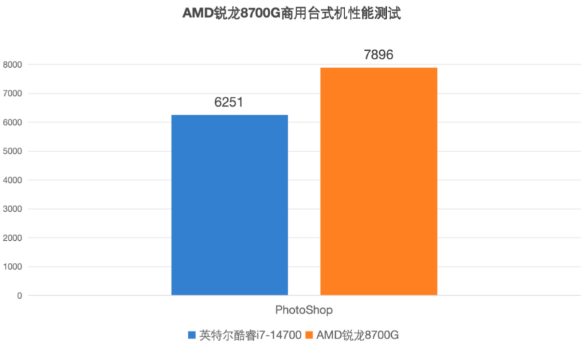 Photoshop是一款广泛使用的图像编辑软件,能够评估处理器在图像处理任务中的性能表现。在Photoshop的综合测试中,锐龙7 8700G的PugetPhotoshop Overall Score为7896,而酷睿i7-14700的得分为6251,性能提升约26%。在Photoshop的各个子项测试中,锐龙7 8700G在滤镜处理速度、图像选择速度、图像调整速度等方面均表现出色,特别是在处理复杂图像时,其高性能集成显卡的优势就变得非常突出。