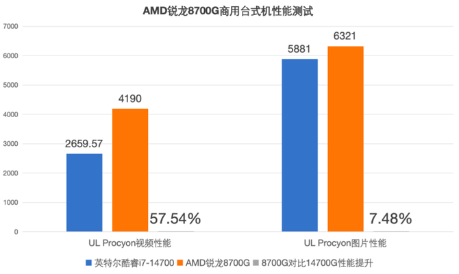 综合考虑硬件采购成本和运营成本,AMD锐龙7 8700G的总拥有成本(TCO)比英特尔酷睿i7-14700低约30%。这种性价比优势使得锐龙7 8700G成为商用台式机的理想选择,特别是在预算有限但对性能和稳定性有较高要求的企业环境中。