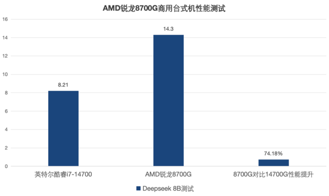 而在生产速度方面,AMD锐龙8700G的14.3 Token/s的性能也比英特尔酷睿i7-14700的成绩领先74.16%,在AI生成性能表现方面,AMD锐龙8700G的表现更好。