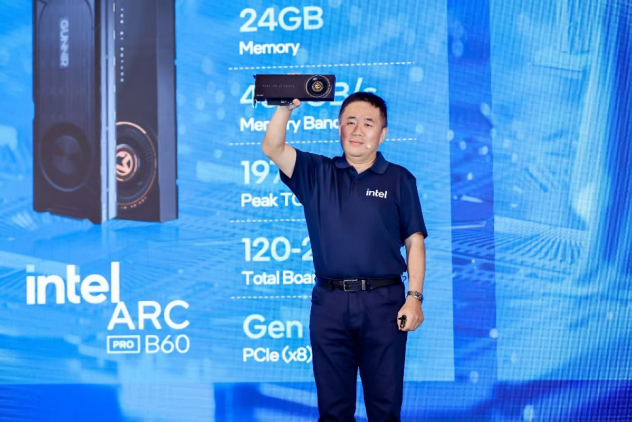 英特尔中国区技术部总经理高宇展示“一卡双芯”的英特尔锐炫Pro B60显卡